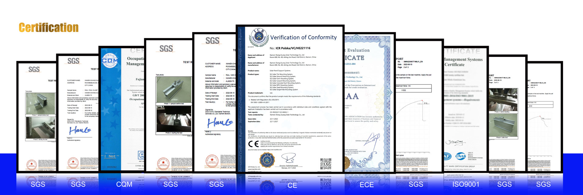 XIAMEN SHANG GUANG TECHNOLOGY SOLAR Co LTD Company is a new energy high-tech enterprise specializing in research and development, production, sales, and service of photovoltaic products. lt is committed to providing customers with stable, reliable, cost-effective, and efficient complete photovoltaic system solutions. Since the establishment of the company, its photovoltaic products: solar modules, solar mounting brackets, inverters, PV cables, grid cabinets, combiner boxes, street lights, etc have been successfully sold to Japan, Europe, India, Korea, Southeast Asia, USA, etc more than 30 countries and regions. And SG Solar has multiple offices in China, Japan, and Germany and numerous production bases for aluminum and iron products with a production area of 400,000㎡, It has obtained multiple international certifications such as lSO, SGS, JIS, CE, AAA, and over one hundred corporate honors, making it one of the few outstanding photovoltaic enterprises. Our rich product line, professional R&D and design team, well-educated workers, management, and sales team, and strict design under international norms and standards have earned the favor and praise of numerous customers. The company has always adhered to the policy of ''independent innovation, customer priority'' and has made significant contributions to promoting the development of renewable enterprise energy and carbon-emission reduction in society.