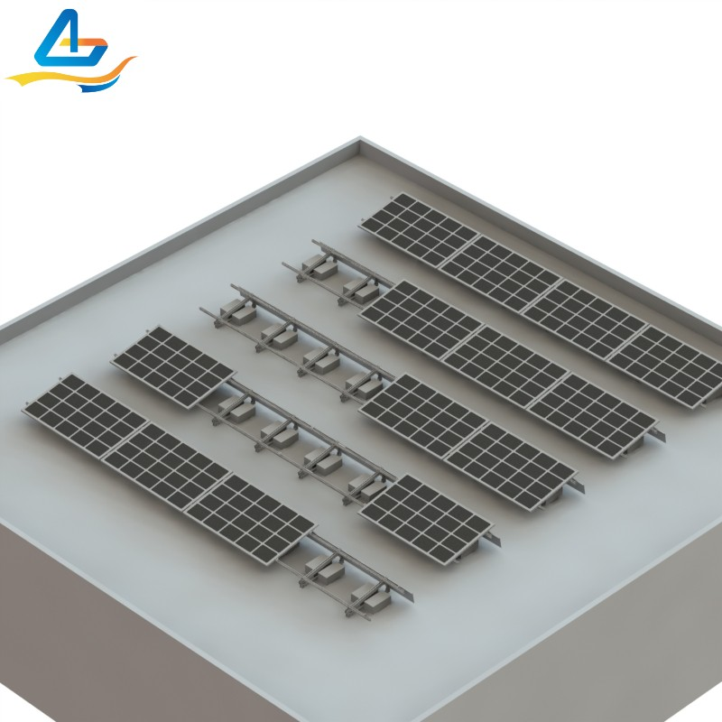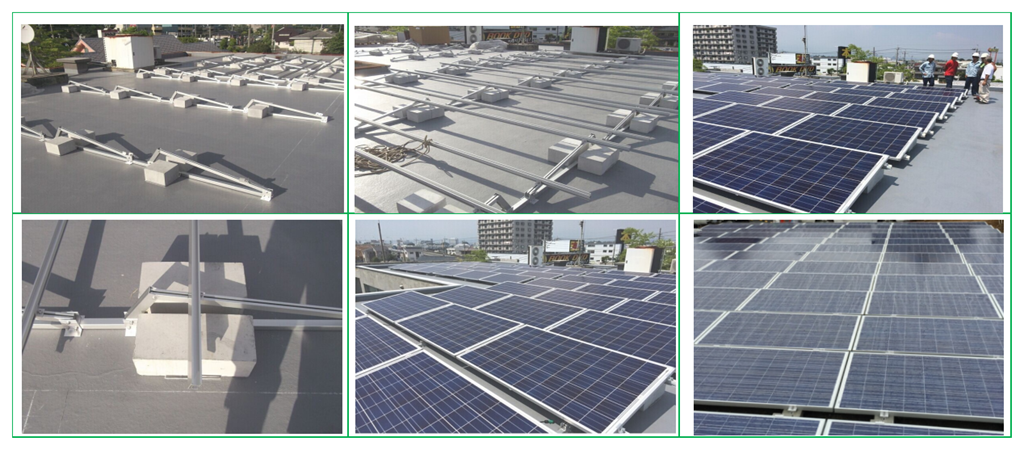 2.It has no damages to the roof by a non-penetrative installation method,it can be only stabalized by ballast concrete blocks or sand bags which put on the ballast tray.Also, it have wind deflector for whole structure stability at site with high wind speed.